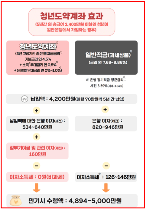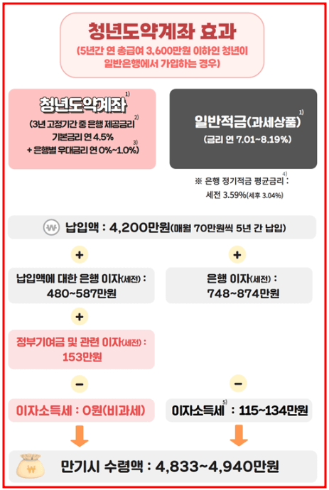 5년간 최대 월 70만원씩 납입하면 목돈 5천만원을 모을 수 있는 상품입니다.