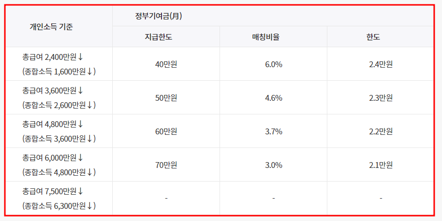 연소득이 4,800만원 이하라면 매월 70만원을 납입하지 않아도 매월 최대 6%의 정부기여금을 받을 수 있죠.