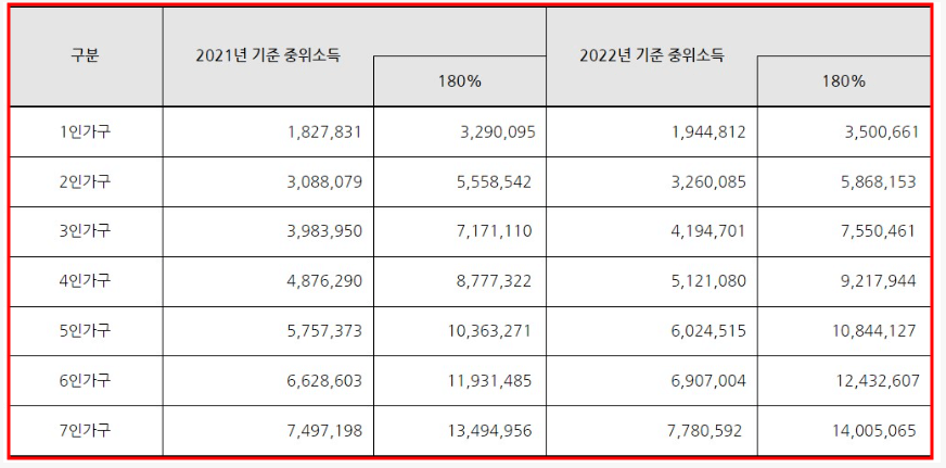 - 가구원 수에 따른 기준 중위소득 180% 이하