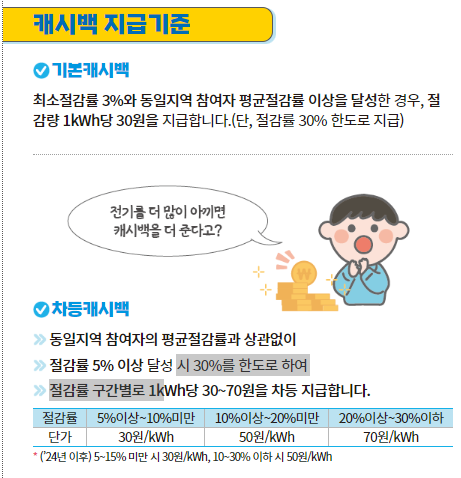 기본캐시백은 최소절감률3%, 동일지역 참여자 평균절감률 이상을 달성한 경우, 절감량 1kWh당 30원을 지급합니다.