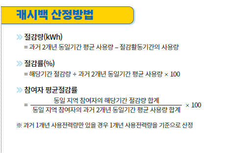 캐시백 산정은 절감량(kWh), 절감률(%), 참여자 평균절감률로 나뉩니다.
