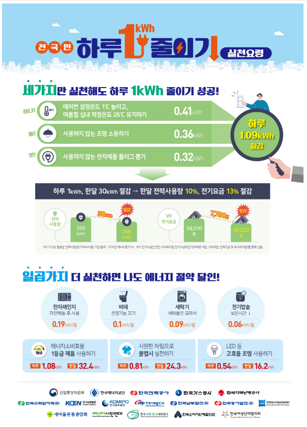 전기 사용량을 얼마나 줄여야 캐시백을 받을 수 있는지 궁금하실텐데요. 하루하루 하나씩 실행하다보면 지금보다 전기 사용량은 확실히 줄어드실 겁니다. 아래에 있는 절약 방법 리스트를 따라해보세요!