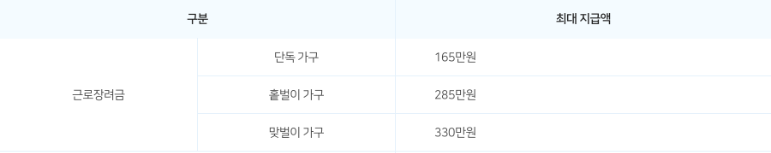 근로장려금 지급액은 단독가구는 165만 원, 홀벌이가구는 285만 원, 맞벌이가구는 330만 원으로 작년보다 10% 늘었습니다.